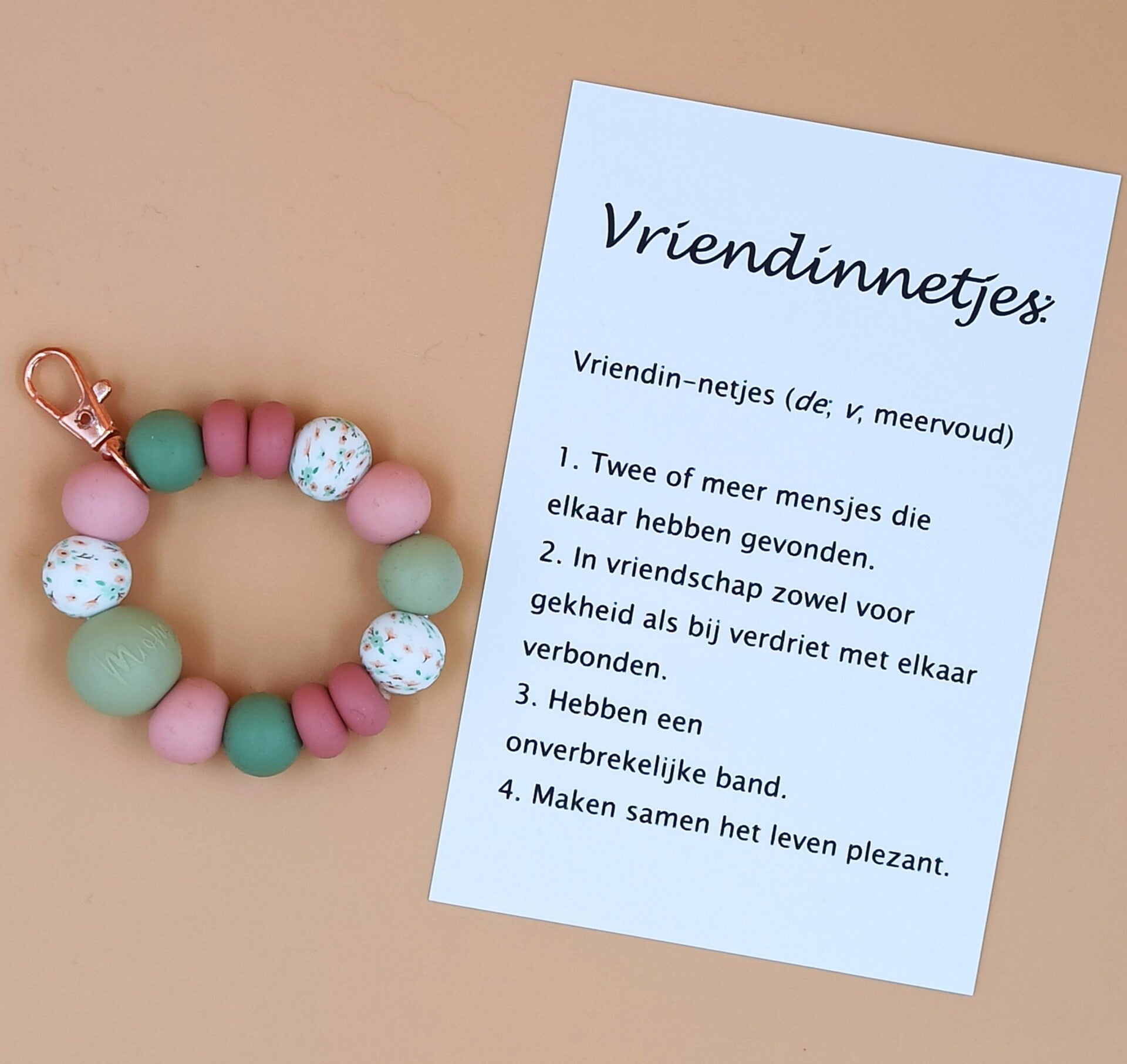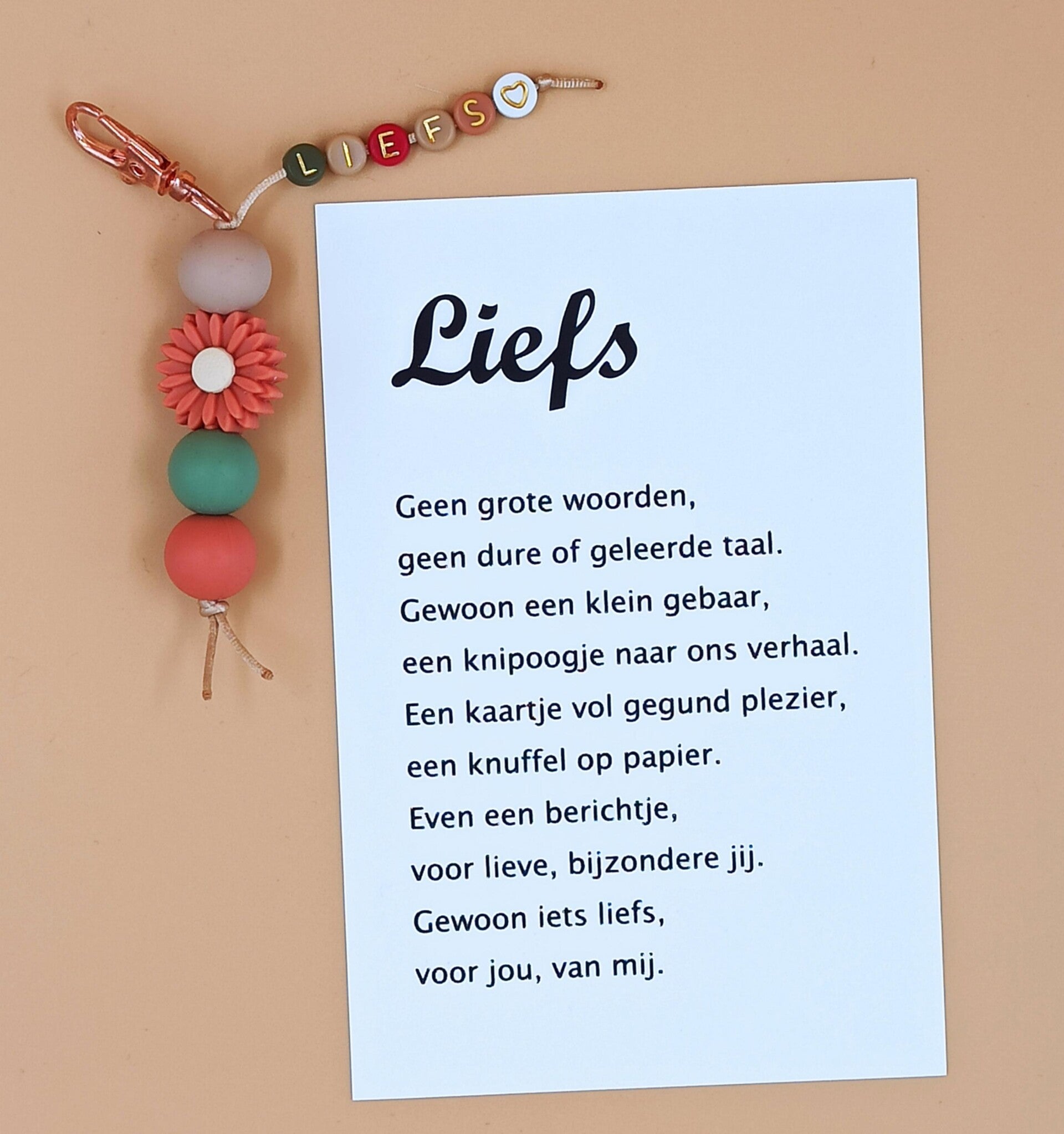 Je kiest uit een kralenaccessoire uit de collectie van Juffra Genoffel (type, kleuren en woord zijn allemaal bespreekbaar) en daarbij kies je een wenskaart uit het volledig assortiment of laat je personaliseren.