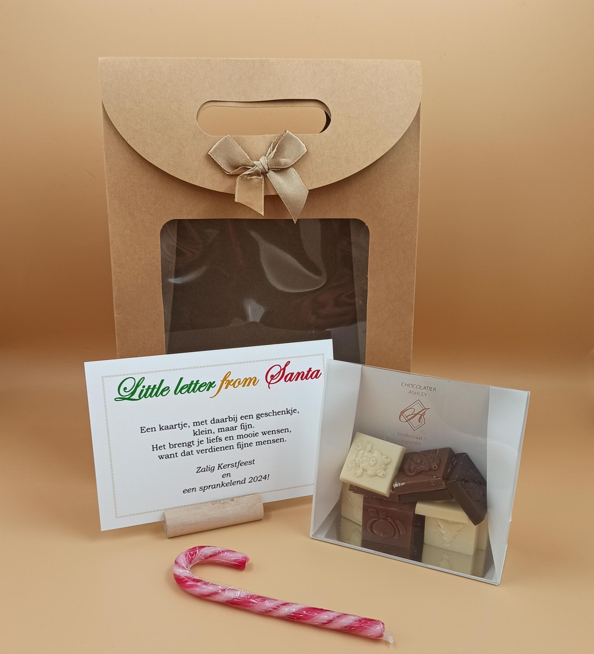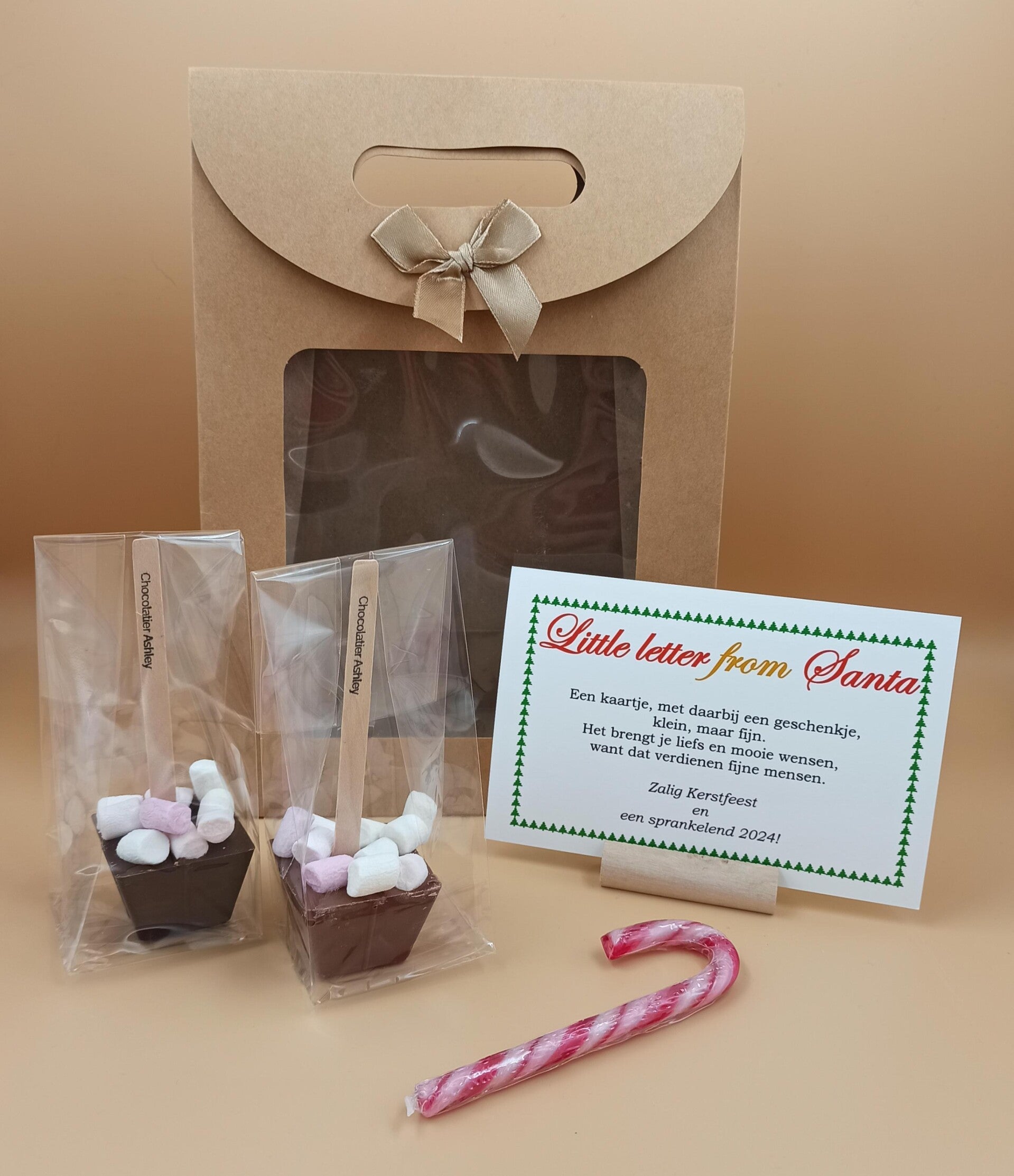 - een doosje handgemaakte kerstchocolaatjes of twee chocosticks met mini marshmallows (om chocolademelk mee te maken) van Chocolatier Ashley