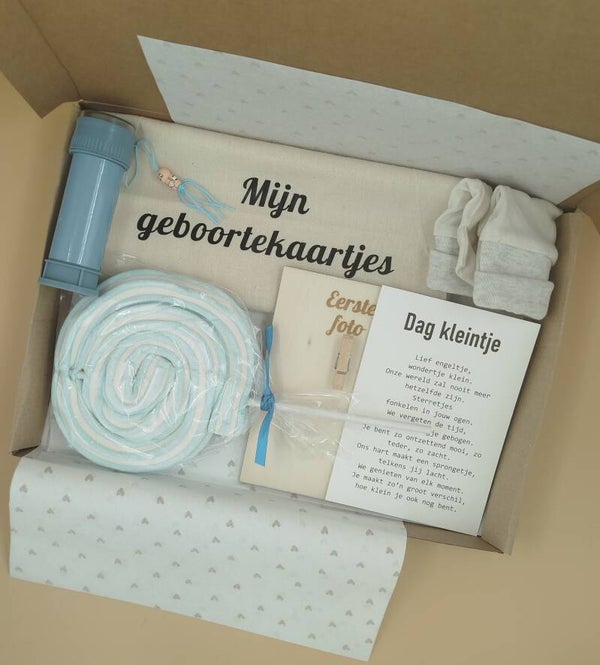 Het pakket bestaat uit: de wenskaart Dag kleintje of een wenskaart naar keuze, een eerste foto-houder, een bewaarzakje voor de geboortekaartjes, een gelukspoppetje, een mutsje, een reuze speklolly en een bellenblaas, allemaal handig verpakt in een brievenbusdoos.